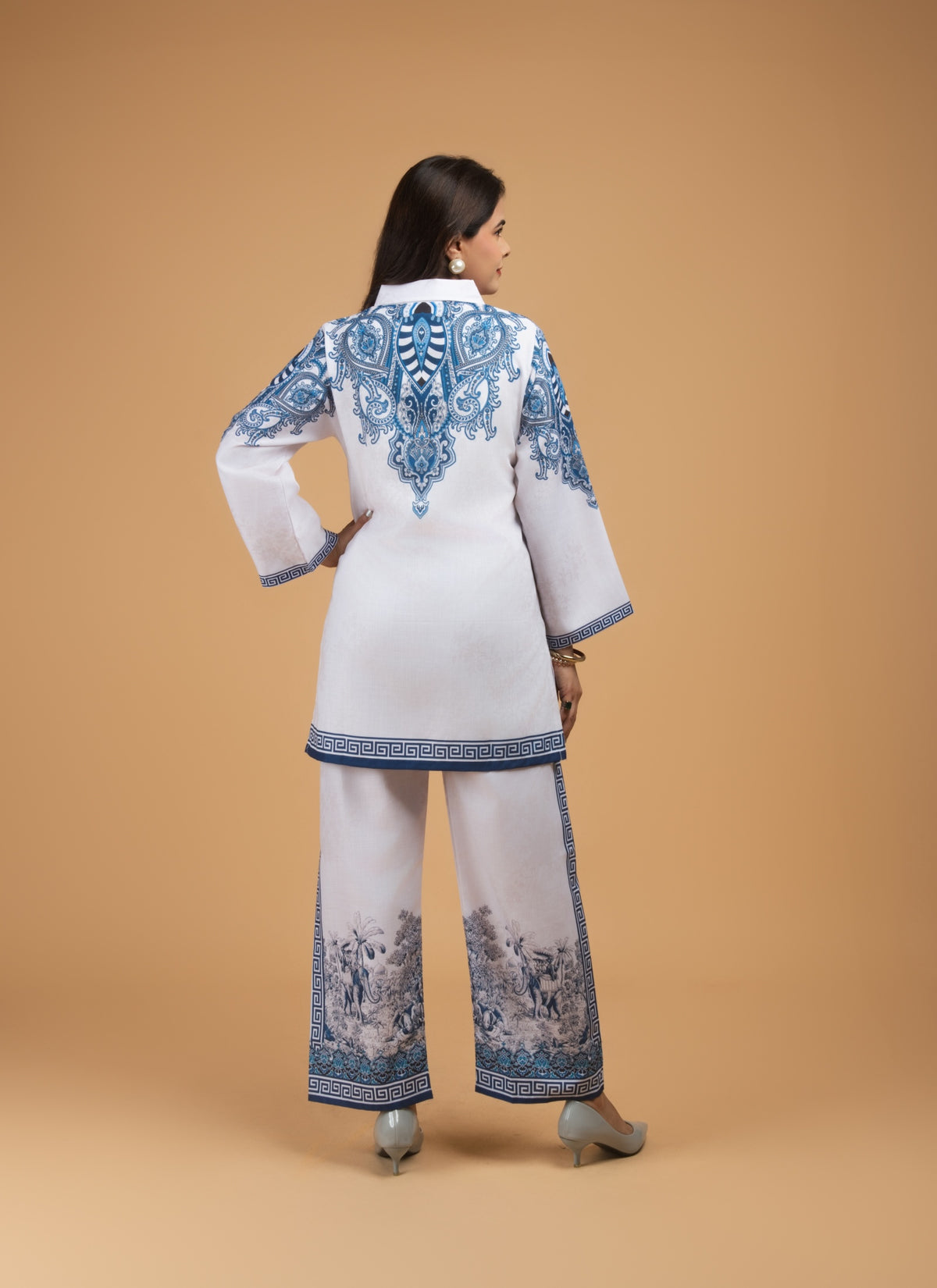 Inspired by fine porcelain artistry, the Indigo Porcelain Co-ord Set brings timeless elegance to your wardrobe. This white button-down kurta features intricate blue motifs that echo vintage ceramic patterns, paired perfectly with wide-leg trousers that display scenic border illustrations. A serene and regal look for the woman who cherishes subtle opulence.
